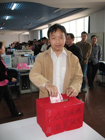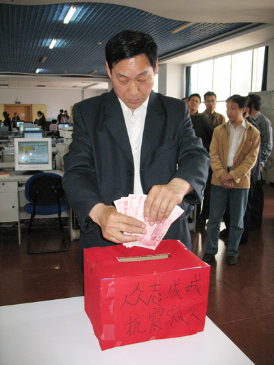 2008年5月12日14時(shí)28分,四川省汶川縣發(fā)生8.0級地震,給當(dāng)?shù)鼐用裨斐删薮蟮纳拓?cái)產(chǎn)損失。為支援災(zāi)區(qū)人們抗震救災(zāi),重建家園,2008年5月15日上午,公司組織“心系災(zāi)區(qū),愛心捐獻(xiàn)”活動。