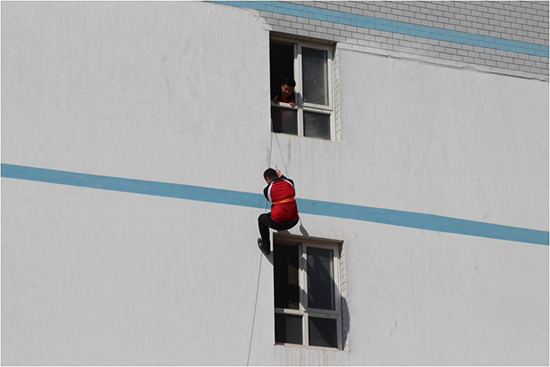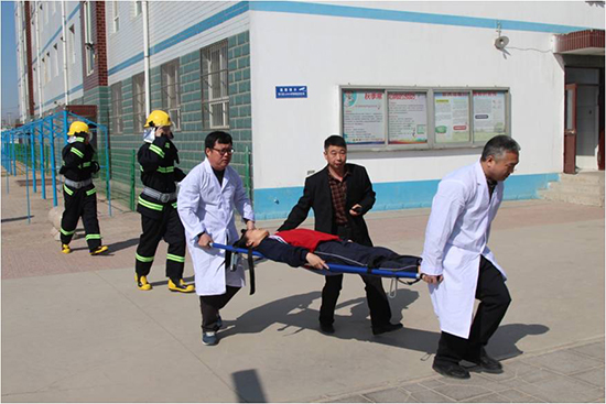 本次活動(dòng)假想新壘頭鎮(zhèn)中學(xué)學(xué)生宿舍樓三樓因線路設(shè)備老化發(fā)生火災(zāi),學(xué)生發(fā)現(xiàn)火情,迅速報(bào)告值班老師,值班老師到現(xiàn)場(chǎng)查看后通知值班室,然后迅速啟動(dòng)消防應(yīng)急預(yù)案,組織學(xué)生進(jìn)行緊急疏散。失火點(diǎn)位于三樓宿舍內(nèi),值班人員率先組織三樓學(xué)生進(jìn)行疏散,之后四樓值班人員聽到廣播開始組織學(xué)生疏散,五樓、二樓、一樓的學(xué)生在老師組織下依次有序疏散。經(jīng)過3分25秒,全校1100多名師生有序疏散完畢,趕到指定地點(diǎn)集合。 學(xué)校消防員接到火災(zāi)通知后迅速穿戴消防戰(zhàn)斗服及防煙面具,攜帶滅火器沖入火場(chǎng),處理初期火災(zāi)。因火勢(shì)太大,無法控制,通訊組匯報(bào)給校長(zhǎng),馮校長(zhǎng)立刻撥打了119火災(zāi)報(bào)警電話。得知一名同學(xué)昏迷,學(xué)校醫(yī)護(hù)人員迅速趕到宿舍樓,用擔(dān)架抬出昏迷學(xué)生,120急救人員立即進(jìn)行搶救。消防人員指導(dǎo)四樓被困學(xué)生用緩降器進(jìn)行自救,并派遣云梯車對(duì)樓頂學(xué)生進(jìn)行營(yíng)救。