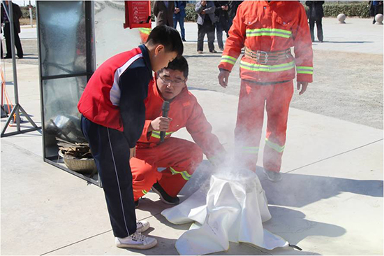 演練結(jié)束后,消防員向同學(xué)們展示了各種消防器材并講解其使用方法,并邀請(qǐng)老師和同學(xué)們一起體驗(yàn)。