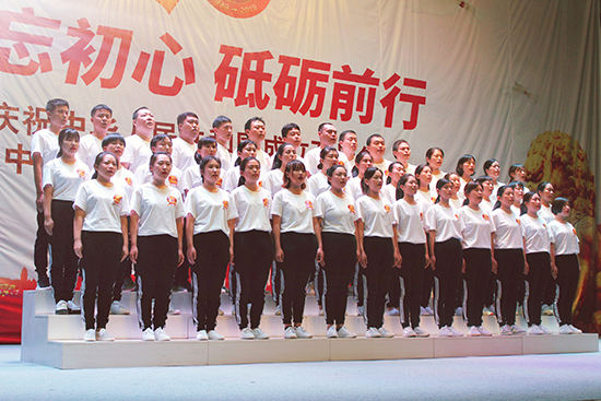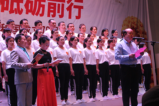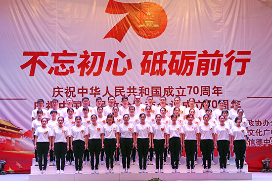 | 2019年9月20日,由辛集市政協(xié)辦公室、辛集市文化廣電體育和旅游局主辦,辛集市信德中學(xué)承辦的慶祝新中國成立70周年和中國人民政治協(xié)商會議成立70周年文藝演出在信德中學(xué)禮堂隆重舉行。 辛集市委副書記、政協(xié)主席姜保康、政協(xié)副主席崔文英、政協(xié)副主席陳貴房,文化廣電體育和旅游局局長馬懷建、市委辦副主任范士杰、教育局副局長姜彥華,民盟、民建、民革、九三學(xué)社、僑聯(lián)等民主黨派代表出席本次慶�;顒�。河北國超信息科技有限公司(以下稱“我公司”)、河北申科電子股份有限公司、萬愛農(nóng)業(yè)科技有限公司、河北天意行榮威4S店、辛集一街荷塘月色舞蹈隊、辛集市實(shí)驗(yàn)學(xué)校、辛集市信德中學(xué)等單位的職工代表隊表演了精彩的節(jié)目。 我公司四十余名員工由總經(jīng)理曹艷爽親自帶隊,組成合唱團(tuán)參加了本次演出。公司高層領(lǐng)導(dǎo)高度重視本次演出,為順利完成本次文藝演出,公司黨支部、工會與各部門負(fù)責(zé)人認(rèn)真組織部署,共先后組織員工精心排演20余次。文藝演出在我公司42名員工激昂、深情的《我和我的祖國》大合唱中拉開序幕,接著我們演唱了熱情、歡快的《洗衣歌》,用歌聲表達(dá)了對黨和祖國的熱愛,把對黨的追隨凝聚成力量,用出色的演出詮釋了不忘初心、牢記使命的錚錚誓言,獲得在場觀眾和領(lǐng)導(dǎo)的高度贊譽(yù)。