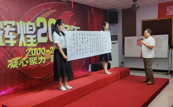 | 二十年崢嶸歲月,二十年風(fēng)雨兼程。二零零零六月間,萬物生長夏初天,河北國超剛起步,轉(zhuǎn)眼已經(jīng)二十年。風(fēng)風(fēng)雨雨匆匆過,兢兢業(yè)業(yè)苦鉆研,同舟共濟(jì)齊努力,勤勤懇懇譜新篇。二十年只是歷史長河中的一剎那,卻是那么的波瀾壯闊。二十年的風(fēng)雨坎坷,二十載辛勤耕耘,二十年見證了昨日的櫛風(fēng)沐雨,二十年守望著明天的燦爛輝煌。2020年6月5日,河北國超信息科技有限公司成立二十周年慶典在公司多媒體會(huì)議室隆重舉行。 參加此次盛會(huì)的有公司董事長劉占查、副董事長劉暢、總經(jīng)理曹艷爽、副總經(jīng)理尹長亮、副總經(jīng)理張軍帥,以及公司各部門管理人員和全體員工。慶典還特別邀請(qǐng)了合資公司北京分公司的喬航副總經(jīng)理、李華峰部長、張波室長、袁川室長、自動(dòng)化工程專家楊廣鑫老師等。出席此次二十周年慶典活動(dòng)的一百多名公司的同仁以及嘉賓,共同為公司二十周歲生日歡呼慶祝,共同分享這份喜悅和精彩。 本次周年慶典為期一天,上午9點(diǎn)半,周年慶典正式開始。公司董事長劉占查、總經(jīng)理曹艷爽、副總經(jīng)理尹長亮、副總經(jīng)理張軍帥分別為慶典發(fā)表了熱情洋溢的致辭,中層領(lǐng)導(dǎo)及部分員工代表也分別發(fā)言,闡述了在公司的奮斗歷程,表達(dá)了公司全體員工堅(jiān)定信念,不斷進(jìn)取,為實(shí)現(xiàn)百年國超的目標(biāo)而努力奮斗的信心和決心。期間播放了公司二十周年發(fā)展歷程宣傳片,參觀了公司文化墻,全體員工及與會(huì)嘉賓表演了詩歌朗誦、獨(dú)唱、大合唱、三句半、京劇等豐富多彩的文藝節(jié)目。慶典現(xiàn)場(chǎng)歡歌笑語,體現(xiàn)了“凝心聚力 筑夢(mèng)未來”的主題,到處洋溢著喜慶氣氛。合資公司為公司二十周年贈(zèng)送了精美的紀(jì)念品,與會(huì)嘉賓特地為這個(gè)特殊的日子編寫了詩詞并獻(xiàn)上了珍貴的書法墨寶,表達(dá)了對(duì)公司二十年奮斗歷程的贊譽(yù)和未來大展宏圖的祝福。 憶往昔歲月崢嶸艱,看今朝國超不畏難。董事長劉占查深情演唱了歌曲《敢問路在何方》,感謝十年來全體員工辛勤與陪伴,感謝各界朋友的大力支持,希望新的一年里,全體員工再接再厲,緊跟公司的前進(jìn)步伐,再創(chuàng)輝煌!