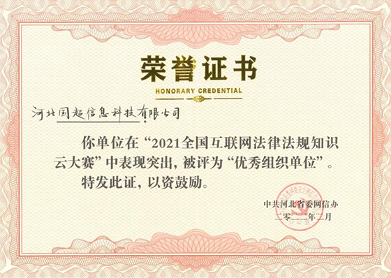 我公司在 “2021年全國互聯(lián)網(wǎng)法律法規(guī)知識(shí)云大賽” 中表現(xiàn)突出,被中共河北省委網(wǎng)信辦評(píng)為 “優(yōu)秀組織單位”。