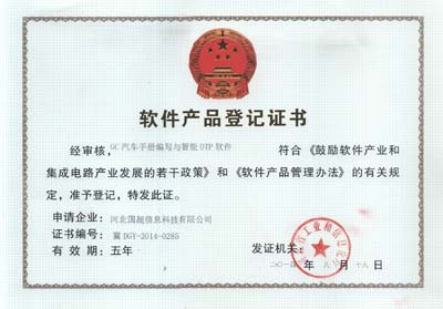 2014年8月18日,我公司研發(fā)的GC汽車手冊(cè)編寫與智能DTP軟件、GC網(wǎng)上項(xiàng)目庫管理系統(tǒng)順利通過河北省軟件評(píng)測中心評(píng)測,并獲得了河北省工業(yè)和信息化廳頒發(fā)的軟件產(chǎn)品登記證書。